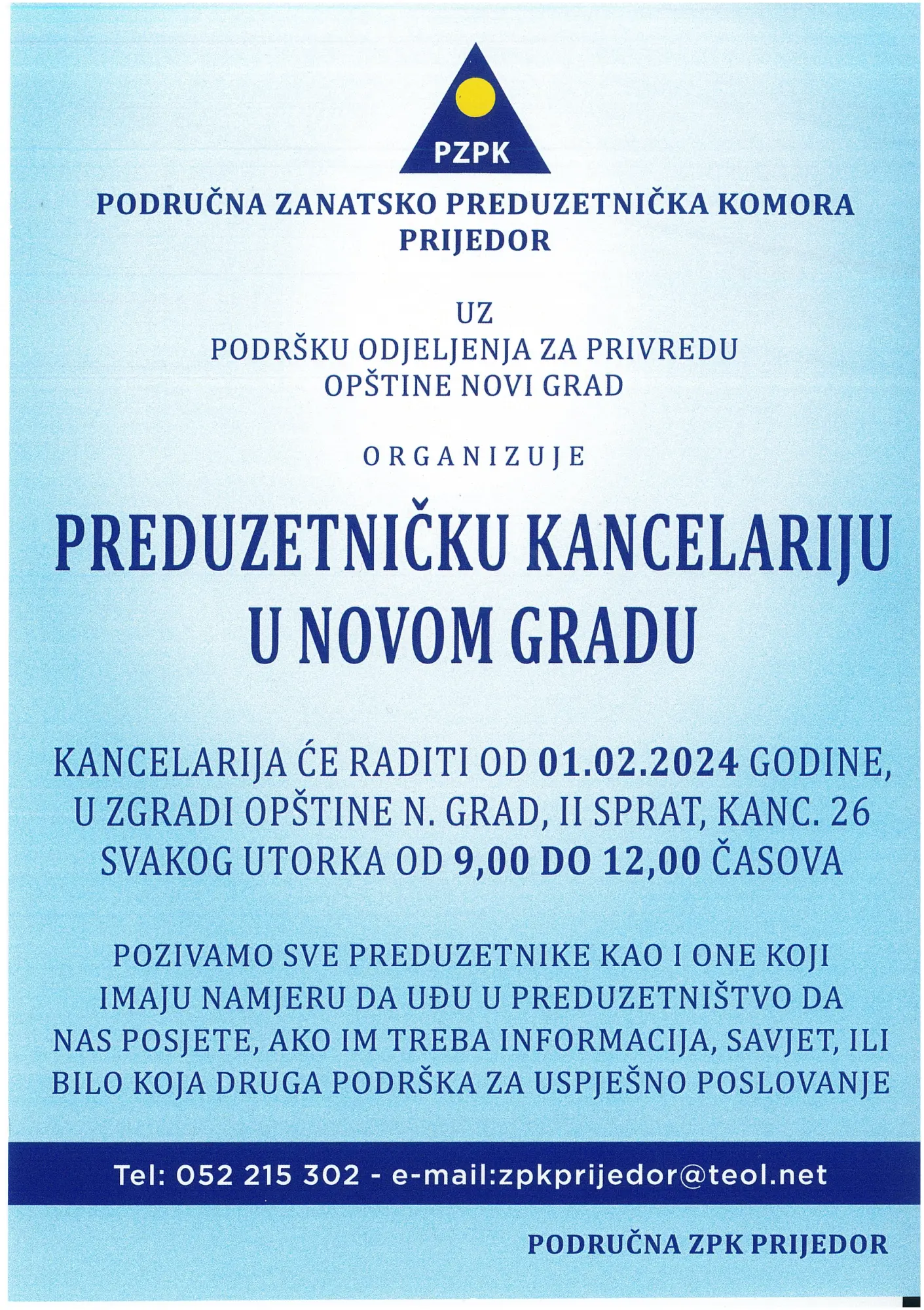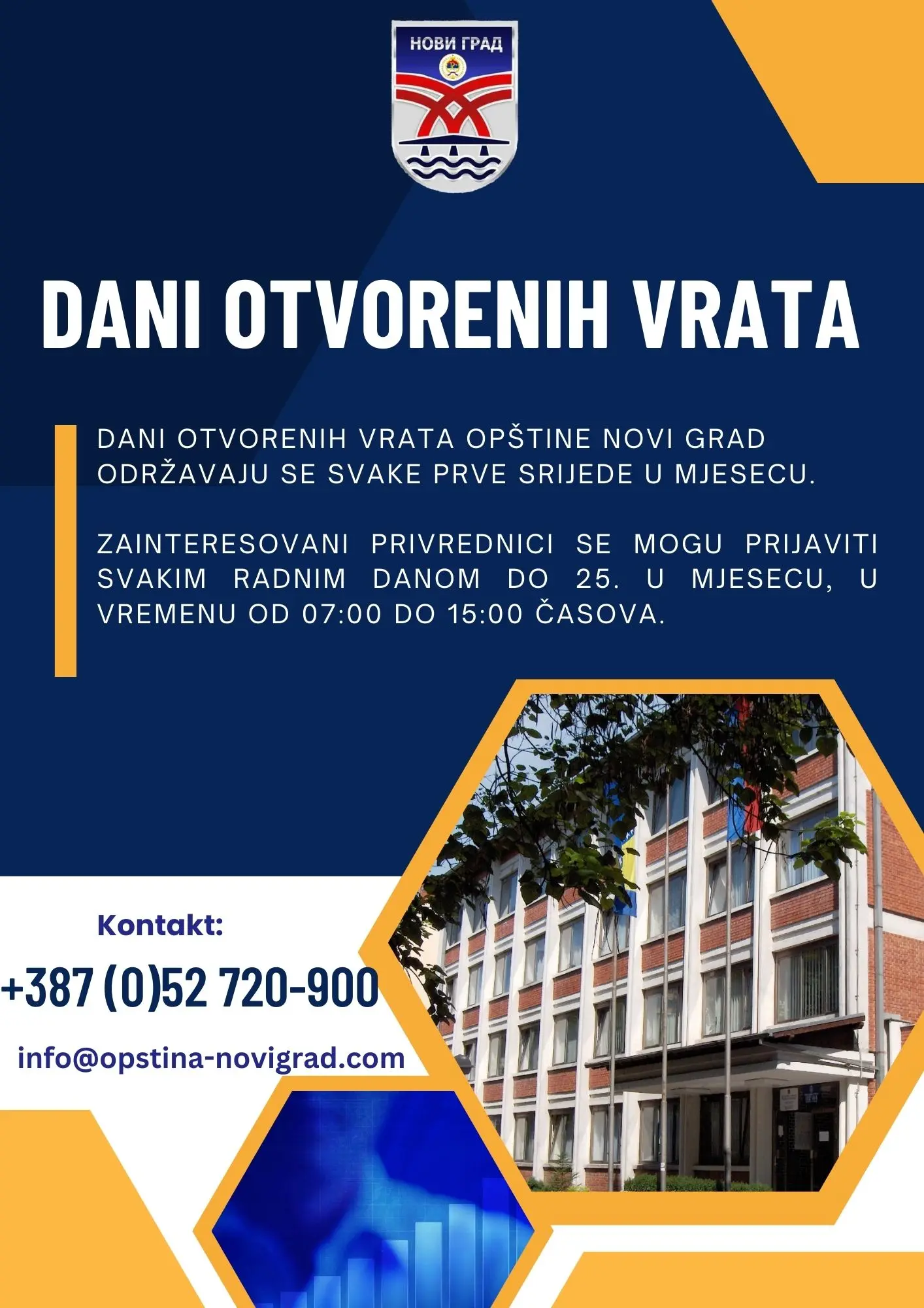 SlužbenestraniceOpštineNovi Grad Dobro došli Investiraj u Novi Grad E-matičar Status Predmeta Prijavi problem Vijesti VIDI SVE Plan kapitalnih investicija za period 2026 do 2028.godineNovi Grad uspješno predstavio turističke potencijale na 6. Međunarodnom sajmu turizma „Banjaluka 2026“Objavljen javni poziv za učešće u programu podrške ženskom preduzetništvu „Мikrofin preduzetnica“Ministarstvo trgovine i turizma: Poziv na registraciju u Centralni informacioni sistem najkasnije do 15. marta 2026. godineNovi Grad predstavlјa turističku ponudu na 47. Međunarodnom sajmu turizma u BeograduOdržana 4. sjednica Privrednog savjeta opštine Novi Grad Godina star Stanovnika Poslovnih subjekata Poljoprivrednih gazdinstava Građani Oglasna tablaPrijava korupcijeOdnosi sa javnošću i pristup informacijamaBesplatna pravna pomoćBudžet opštineMatična služba opštine Novi GradOpštinski štab za vanredne situacijeForum za bezbjednostTeritorijalna vatrogasno-spasilačka jedinicaServis 48-Prijavite komunalne problemeParking službaSlužbeni glasniciOdsjek za civilnu zaštituVažniji telefoniJavne nabavke E-usluge e-MatičarNaručite izvode i uvjerenja iz matičnih knjiga e-DijasporaPonudite saradnju ili postavite pitanje e-DokumentiZahtjevi i obrasci e-RegistracijaElektronski administrativni postupci zapreduzetnike SERVIS 48Prijavite komunalne probleme Investiraj u Novi Grad Novi Grad posjeduje svu potrebnu infrastrukturu i sisteme, koji ovaj mali grad čini dostupnijim i fleksibilnijim u poređenju sa većim gradovima. Zašto investirati u Novi Grad Troškovi poslovanja Dozvole Započnite posao Pronađite lokaciju Doživi Novi Grad By Robert Dacešin Vodene staze (autor: Bojan Mijatović) Sasvim prirodno (autor: Jovan Memedović)