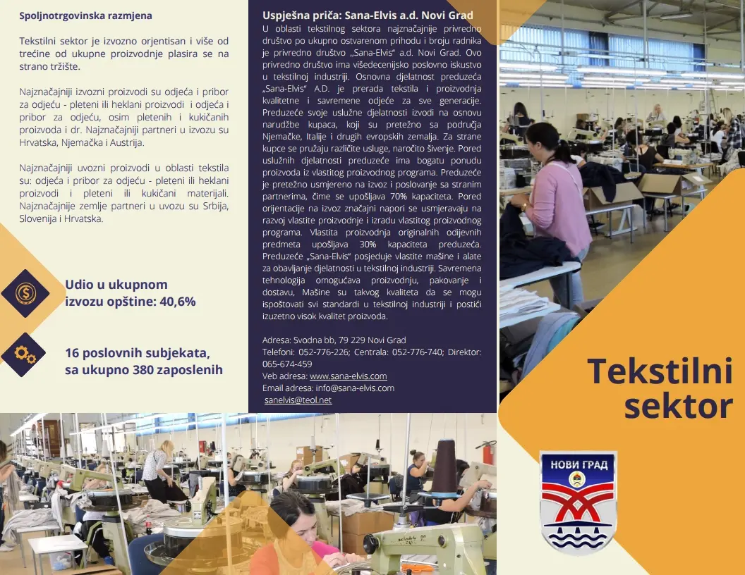 Tekstilna industrija u opštini Novi Grad ima dugogodišnju tradiciju, kvalifikovanu radnu snagu, prepoznatljivost i mogućnost daljeg proširenja proizvodnih kapaciteta.
