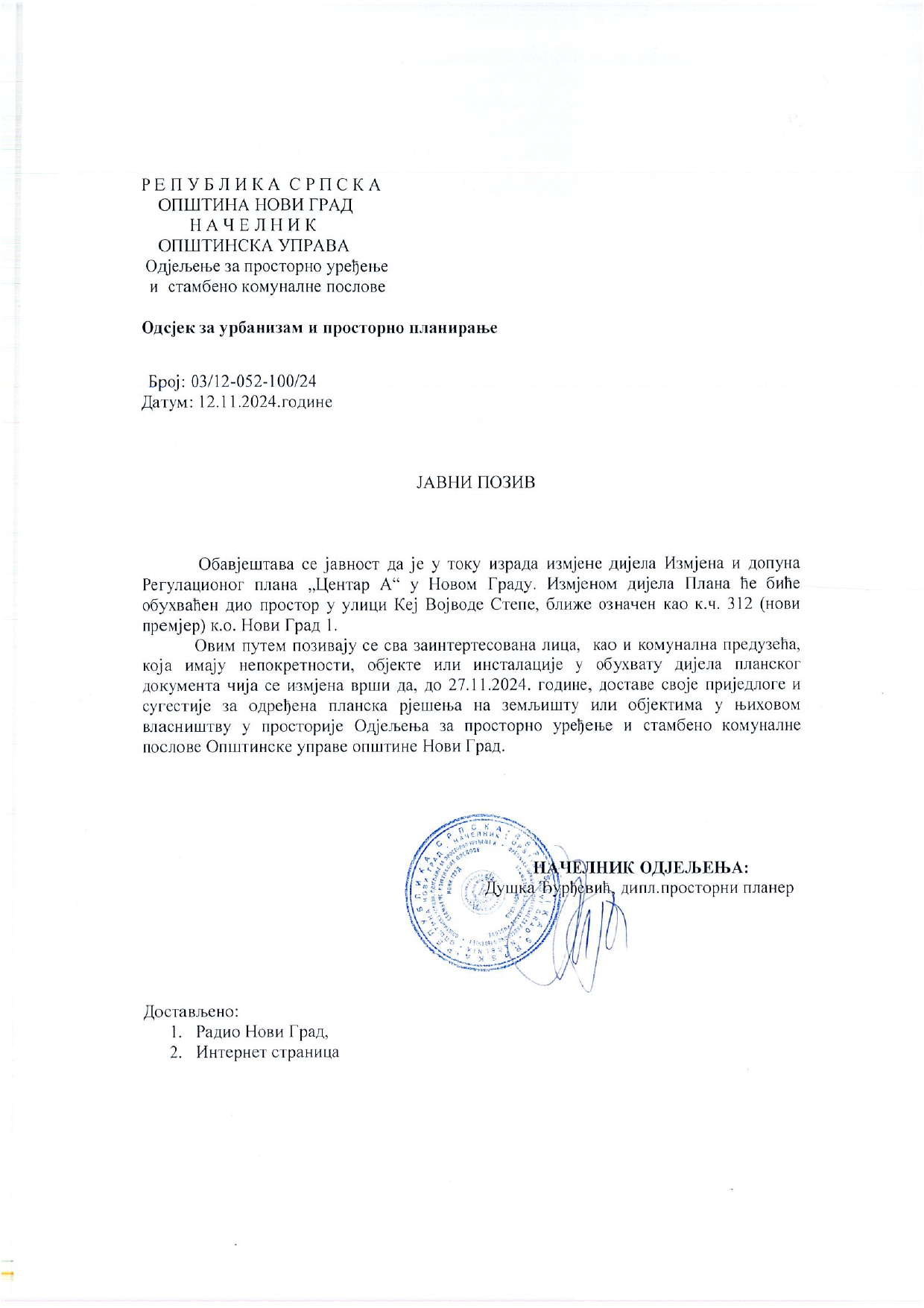 Ovim putem se pozivaju sva zainteresovana lica, kao i komunalna preduzeća, koja imaju nepokretnosti, objekte ili instalacije u obuhvatu dijela planskog dokumenta čija se izmjena vrši da, do 27.11.2024.godine, dostave svoje prijedloge i sugestije za određena planska rješenja na zemljištu ili objektima u njihovom vlasništvu, u prostorije Odjeljenja za prostorno uređenje i stambeno- komunalne poslove Opštinske uprave Opštine Novi Grad, Petra Kočića 2, III sprat, kancelarija br. 42.