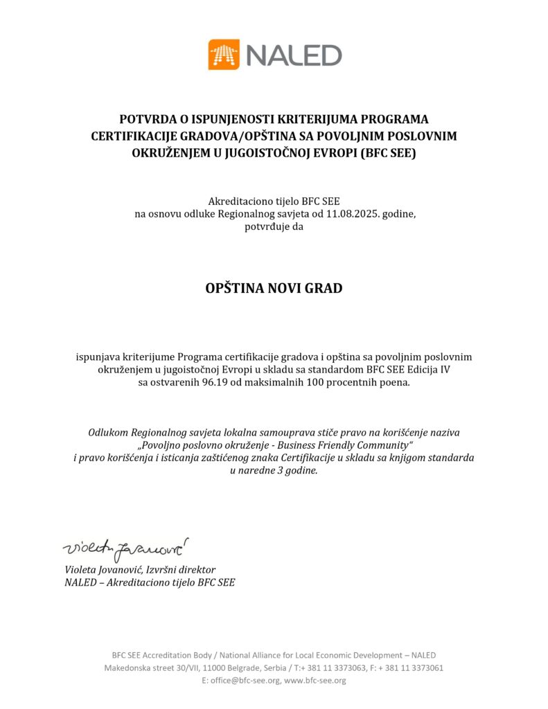 Akreditaciono tijelo za BFC SEE Program je, na osnovu odluke Regionalnog savjeta od 11.08.2025. godine, potvrdilo da opština Novi Grad ispunjava kriterijume Programa sertifikacije gradova i opština sa povolјnim poslovnim okruženjem u jugoistočnoj Evropi u skladu sa standardom BFC SEE Edicija IV, ostvarivši izuzetnih 96,19 od maksimalnih 100 procentnih poena. Prvi BFC SEE sertifikat Opština je stekla 2019. godine po III Ediciji standarda, a novi proces sertifikacije potvrdio je kontinuitet vrhunskih rezultata, institucionalnu zrelost i snažnu saradnju sa privredom.