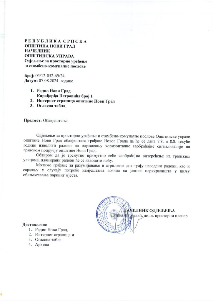 Odjeljenje za prostorno uređenje i stambeno-komunalne poslove Opštinske uprave opštine Novi Grad obavještava građane Novog Grada da će se dana 7.8. i 8.8. tekuće godine izvoditi radovi na održavanju horizontalne saobraćajne signalizacije na gradskom području opštine Novi Grad.
