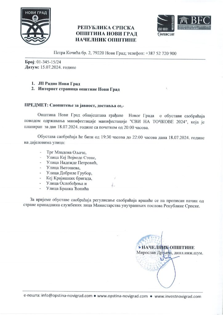 Zbog održavanja manifestacije “SVI NA TOČKOVE 2024”, saobraćaj će biti obustavljen u četvrtak, 18. jula 2024. godine u vremenskom periodu od 19.30 do 22.00 časa u ulicama: