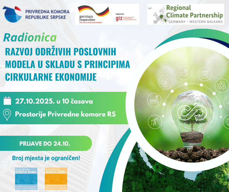 Privredna komora RS poziva predstavnike preduzeća da učestvuju na radionici „Razvoj održivih poslovnih modela u skladu s principima cirkularne ekonomije“, koja će se održati 27.10.2025. godine sa početkom u 10 časova u Privrednoj komori Republike Srpske, ulica Branka Ćopića 6, Banja Luka.